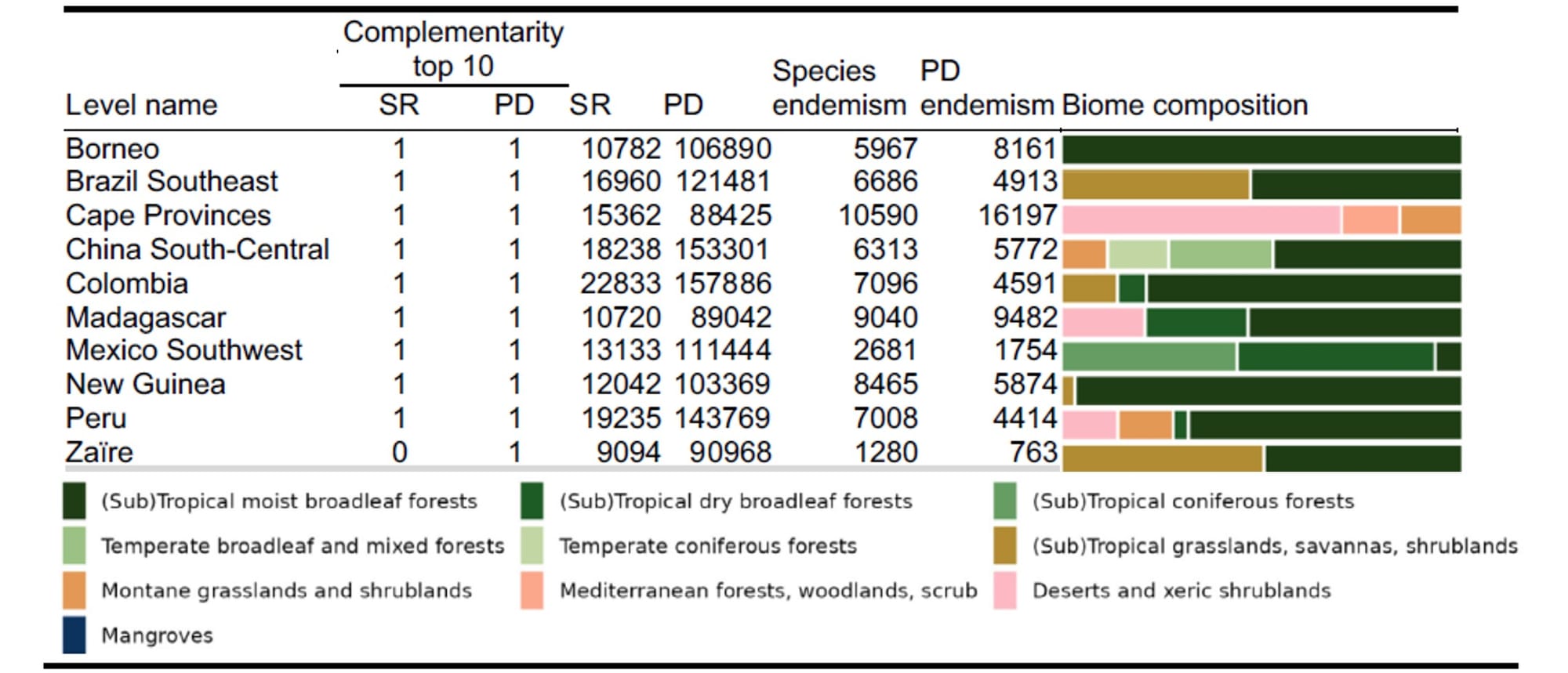 Results of this study highlight the risks of prioritizing only species-rich areas. Indeed, other regions – such as (sub)tropical dry forest and coniferous forest – should be included to preserve global seed plant biodiversity (Figure 3).