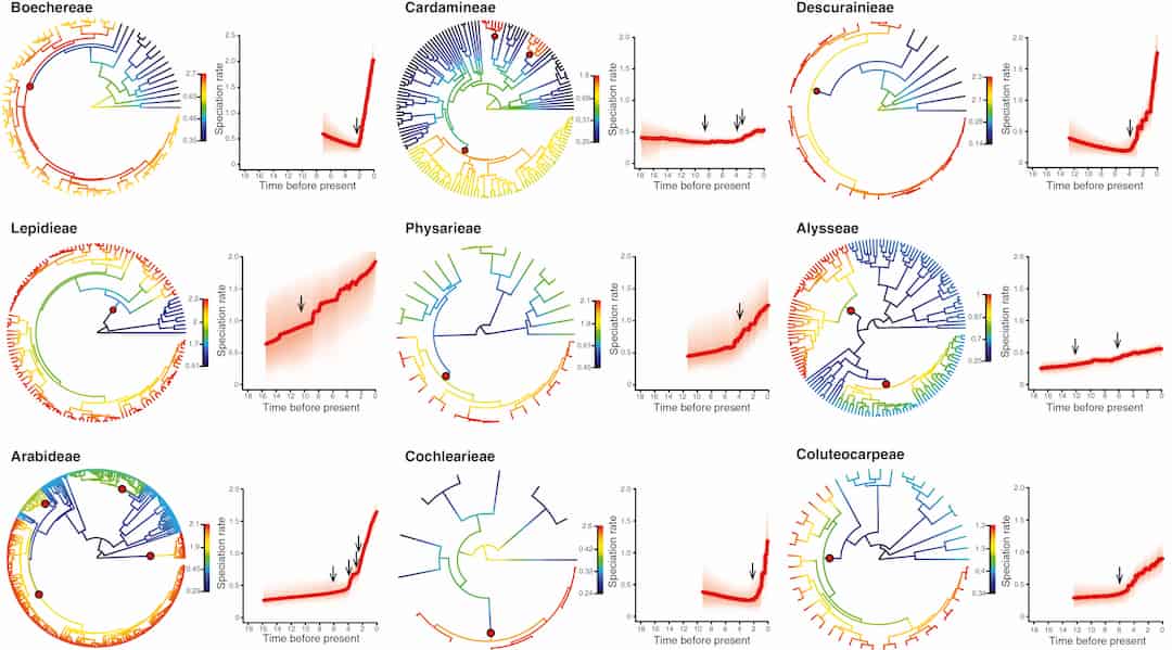 “(1) Significant rate shifts are seen in 12 out of 52 tribes across Brassicaceae, which are decoupled from mesopolyploid WGDs. Shifts that were detected within tribes were randomly distributed over the time span, indicating no single epoch contributing to a major burst in Brassicaceae diversification. However, the Pliocene–Pleistocene is playing a major role for present-day Brassicaceae diversity and highlights that diversification of Brassicaceae is generally favoured by cooler and drier conditions. Pleistocene glacial/deglaciation cycles may have contributed to the maintenance of the high diversification rate in Brassicaceae.
