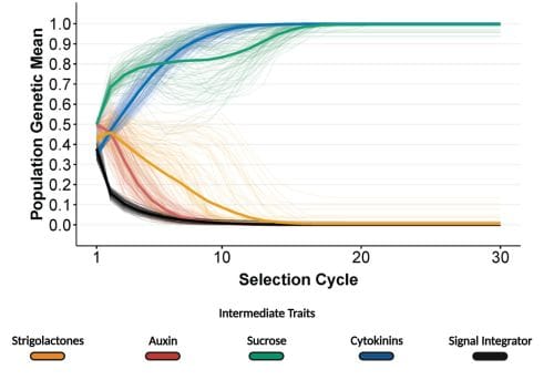 To examine the drivers of the unexpected responses to selection, they then examined the patterns of hormone and sucrose levels and allele frequency of the populations over the selection cycles. “The unexpressed genetic expression for sucrose can be explained by the complex interaction between sucrose and strigolactone signalling in the gene-to-phenotype network. Multiple genetic combinations of sucrose and strigolactone produce similar values for the bud outgrowth, resulting in genotypes with completely different combinations of strigolactone and sucrose levels producing similar values for time to bud outgrowth,” Powell continued.