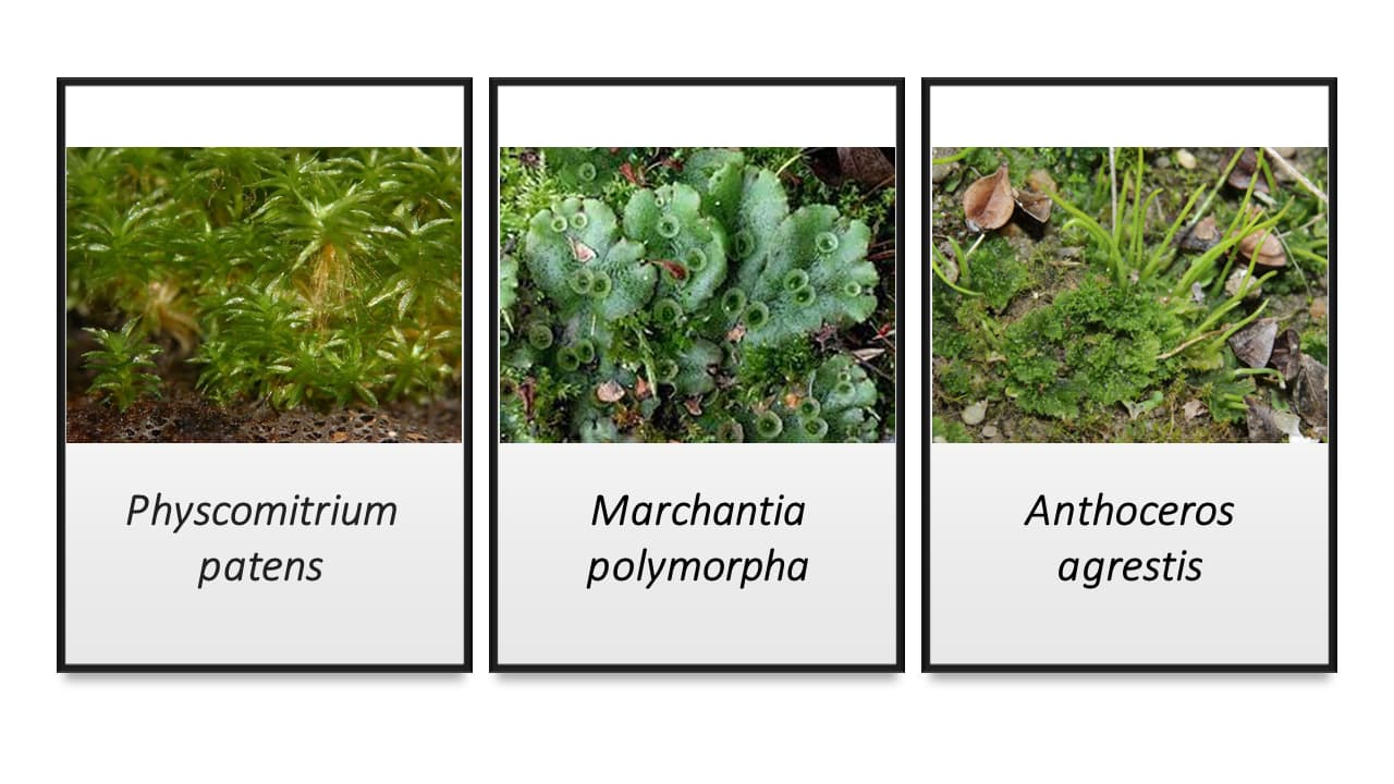 Bryophytes (liverworts, mosses, hornworts) are a living example of early embryophytes (Figure 3) showing key evolutionary innovations: the transition from 2D to 3D growth, the development of leaf-like structures and rhizoid filaments (as anchorage system), and dominance of haploid gametophyte in the life cycle.
