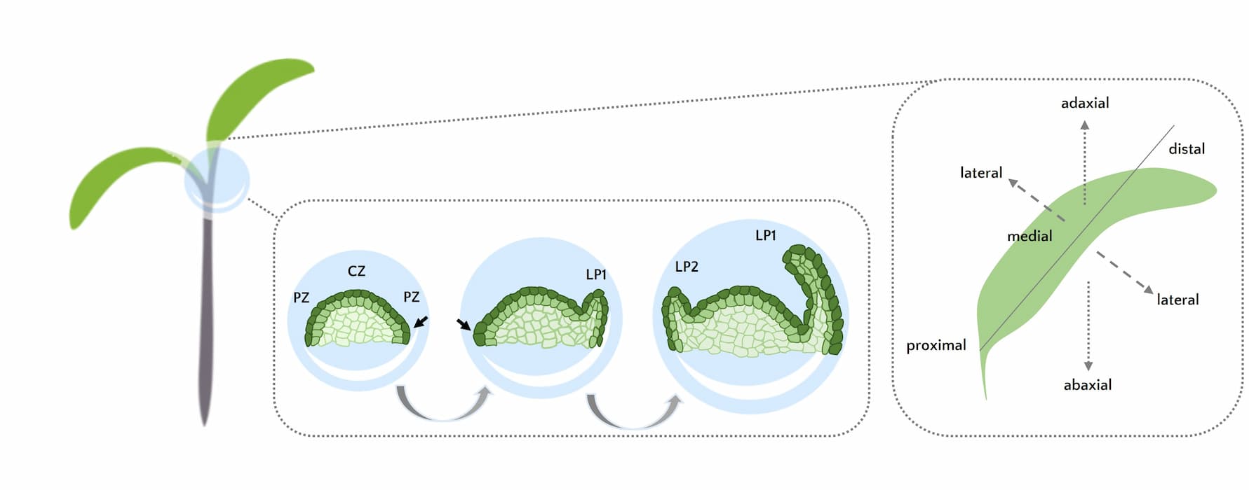 Upon seed germination, pluripotent cells of the Shoot Apical Meristem (SAM) give rise to all above-ground organs throughout a plant life cycle. While cells of the central zone maintain the pool of undifferentiated cells by slowly dividing, cells of the peripheral zone acquire a determinate identity to generate lateral appendages following three main axes (Figure 2):
