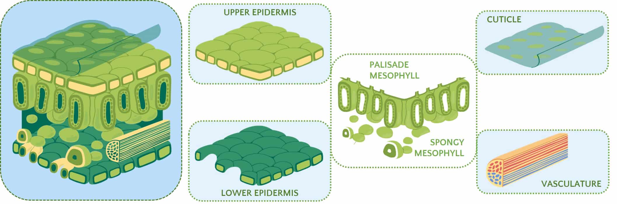 At maturity, a typical leaf is composed of a stalk that connects the flat part (called blade) to the stem. Despite the great diversity in leaf morphology, leaves share a common structure (Figure 3), composed of three tissues with different functions: