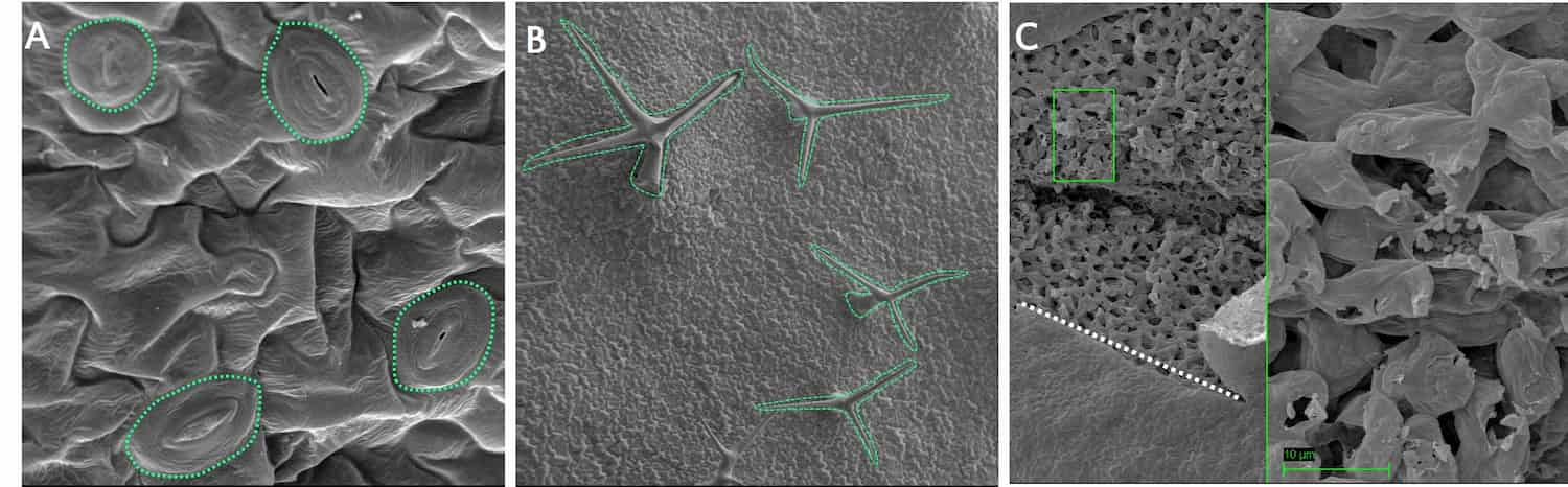 A closer look at mature leaves reveals the presence of specific cell types (e.g., pavement cells, stomata and trichomes, Figure 4) that play key roles in plant interaction with the environment as well as in plant defence against abiotic and biotic stresses (Botanical Pill Plants under pressure).