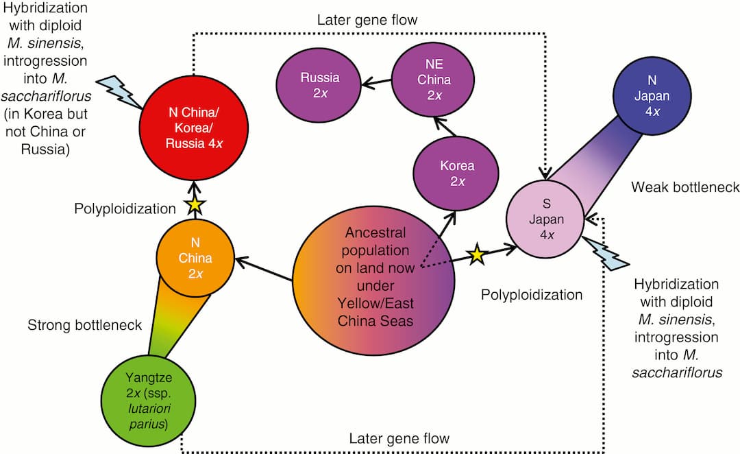 The results they gathered suggested the most genetically diverse region had been lost to sea level rise since the last glacial maximum. “Multiple lines of evidence indicate that current populations of M. sacchariflorus were derived from an ancestral population that refuged during the last glacial maximum (LGM) on land that is now under the Yellow Sea and East China Sea. Perhaps most compelling is the observation that the four most genetically diverse extant M. sacchariflorus groups currently inhabit land surrounding these seas, whereas derived sub-groups are found more distant, indicating a radiation from this region.”