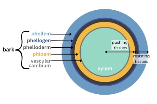 Biomechanical stimuli—consisting of physical forces and mechanical signals—affect the growth of stem tissues and cells, influencing bark development. Vascular cambium cells divide into xylem and phloem, while phellogen gives rise to phellem and phelloderm, leading to radial growth and stem expansion which creates outward and tangential pressure on surrounding tissues. This internal tension and pressure serve as stimuli that can affect further cell division and differentiation, regulating rates of cell division and elongation.