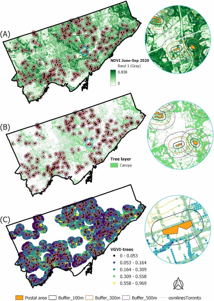 This crucial data was married with objective measures of greenness—the Normalized Difference Vegetation Index (NDVI), per cent tree canopy cover, and the Viewshed Greenness Visibility Index (VGVI). The team used satellite imagery and land cover data from the City of Toronto to calculate these measures at three neighbourhood distances. The distances selected were assumed to represent areas that residents would walk through during their day-to-day activities.