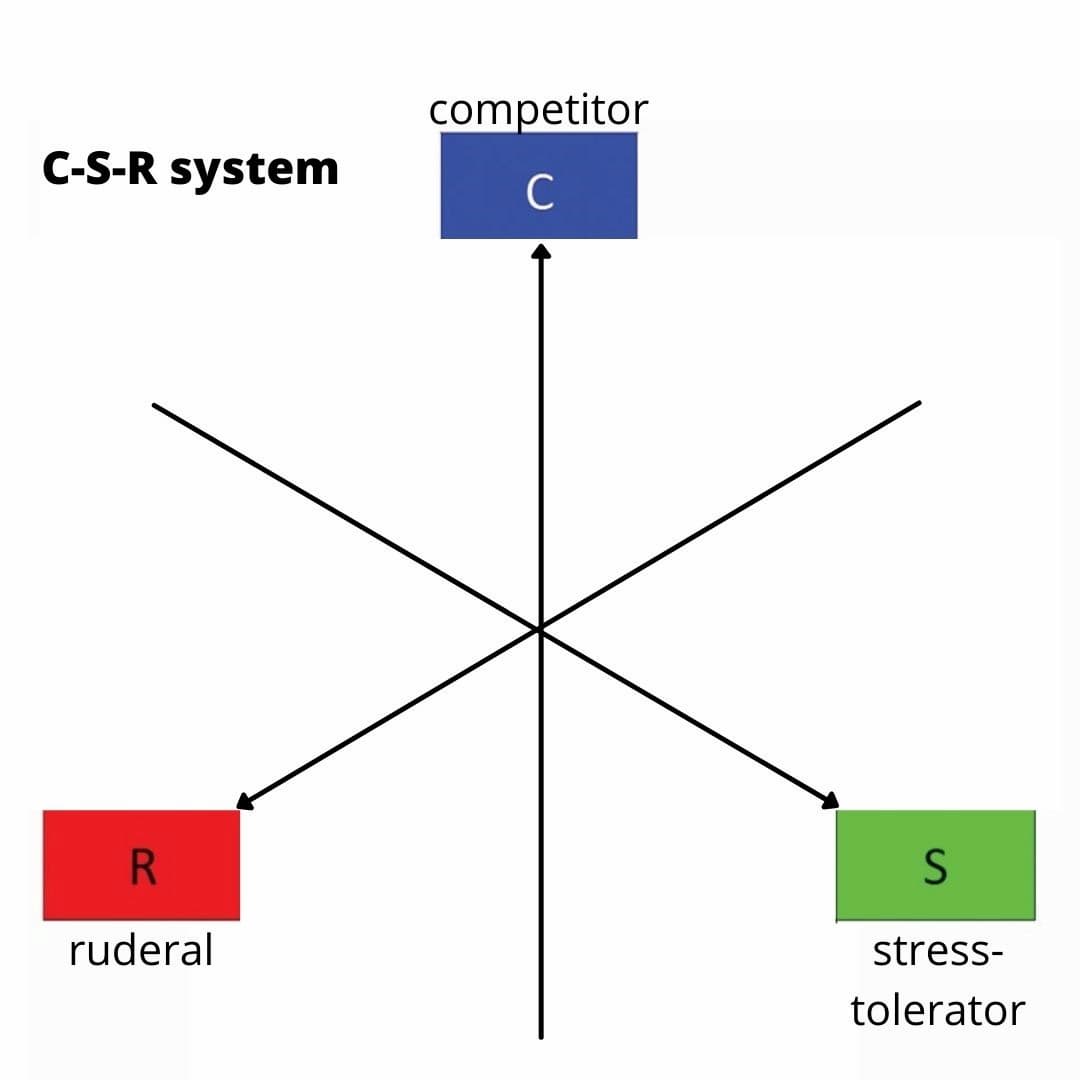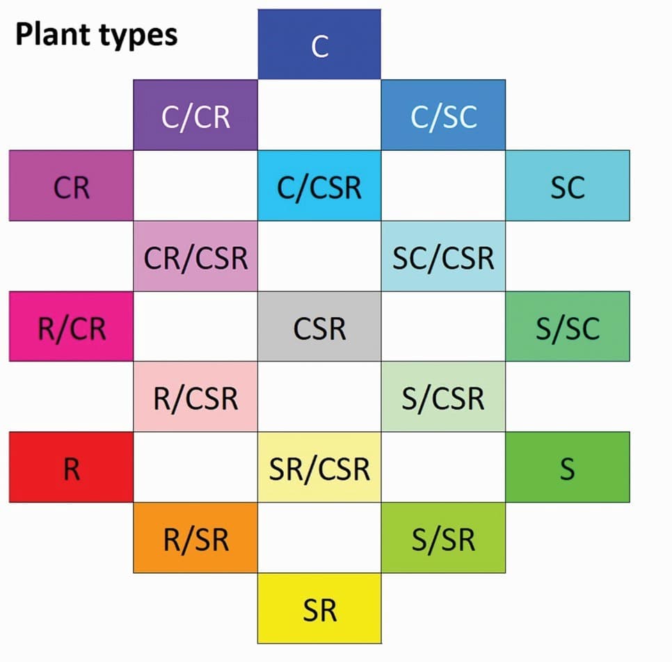 To represent plant life the authors used 19 functional types, each representing a broad grouping of plant species that shares the same role within ecosystem function. The functional types are represented using the C–S–R classification of plant species: C (competitor), S (stress-tolerator) and R (ruderal). There are many intermediates, but at each of the three extremes Competitive plants have a high probability of vegetative growth under conditions of high resource and low disturbance; stress-tolerant plants have a high probability of surviving low resource and low disturbance; and ruderal plants have a high probability of growth from seed under high resource and high disturbance. There are no plant types that can survive low resource and high disturbance. Each of the 19 functional types occupies its own characteristic part of C-S-R space.