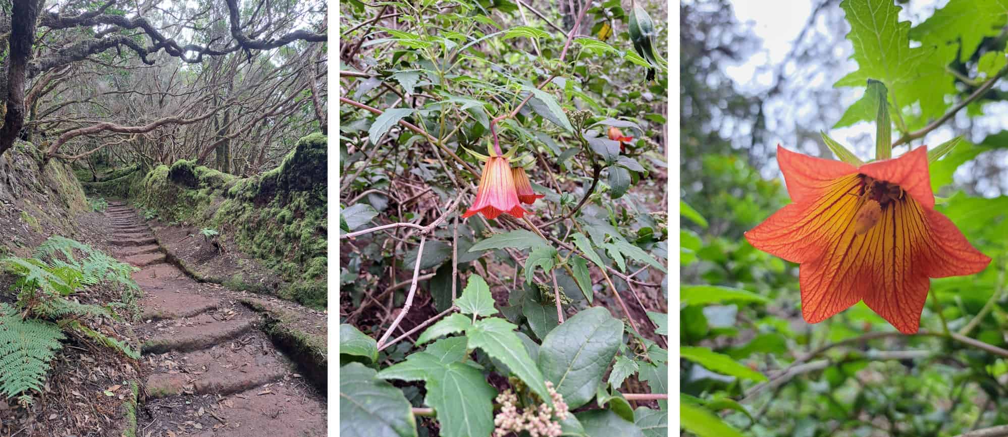 The bell-shaped flowers of Canarina canariensis exhibit a yellow to orange corolla adorned with red vasculature, adding a vibrant splash of colour to the greenery of laurel forests at the end of the winter and the beginning of the spring. This trailing herbaceous species – belonging to the Campanulaceae family – thrives in shaded environments and has adapted its reproductive organs for bird-mediated pollination (Figure 1).
