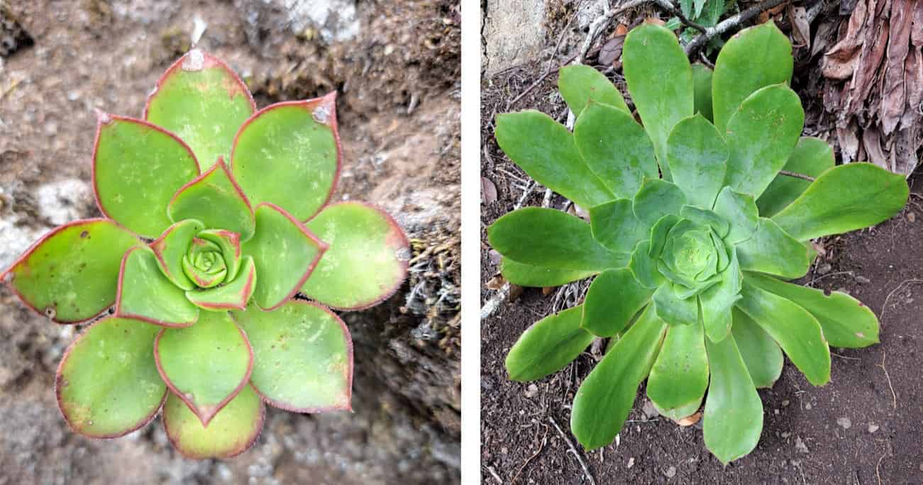 The Canary archipelago also hosts a remarkable diversity of plant species from the Crassulaceae family, a group of succulents that have adapted to harsh environments (e.g., rocky slopes, volcanic landscapes, and coastal cliffs) by developing fleshy leaves able to store water. Several endemic species – such as those belonging to the Aeonium genus – have evolved unique forms and can be easily recognised for the striking shape of their bright green rosette leaves (Figure 3). These drought tolerant species usually follow a winter-growing cycle, that enable green organisms to withstand dry conditions becoming dormant during the hot summer.